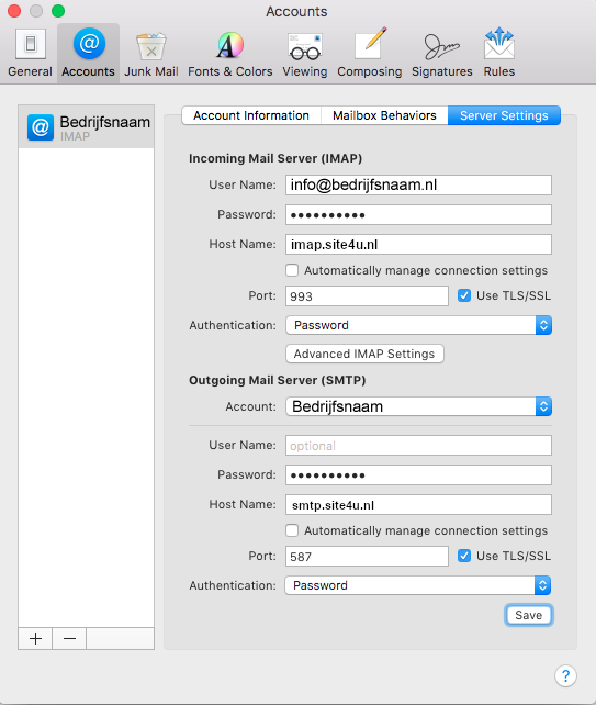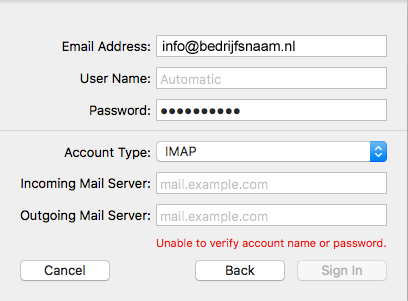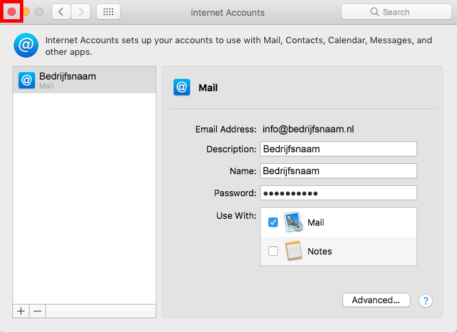 - Email Address: Het email-adres waarop de mail van het account binnenkomt, bijvoorbeeld info@bedrijfsnaam.nl