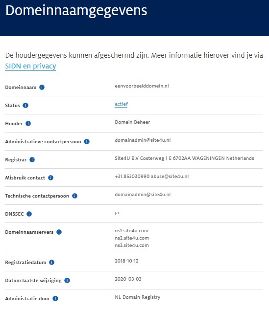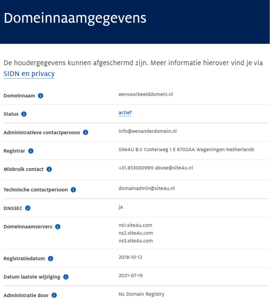 Voor een .nl domein kan Whois-Privacy alleen verkregen worden via een opt-out verzoek. De gegevens van de Registrar (bijv. Site4U) worden dan weergegeven bij ‘Houder’ en ‘Administratieve contactpersoon’.