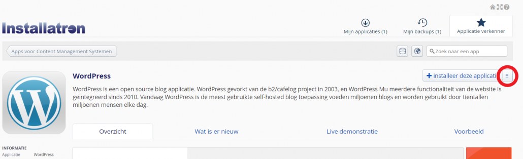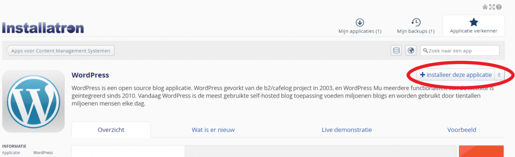 Op het moment dat je een software pakket hebt gekozen, verschijnt er een scherm met meer informatie over het pakket (bijvoorbeeld voor WordPress):