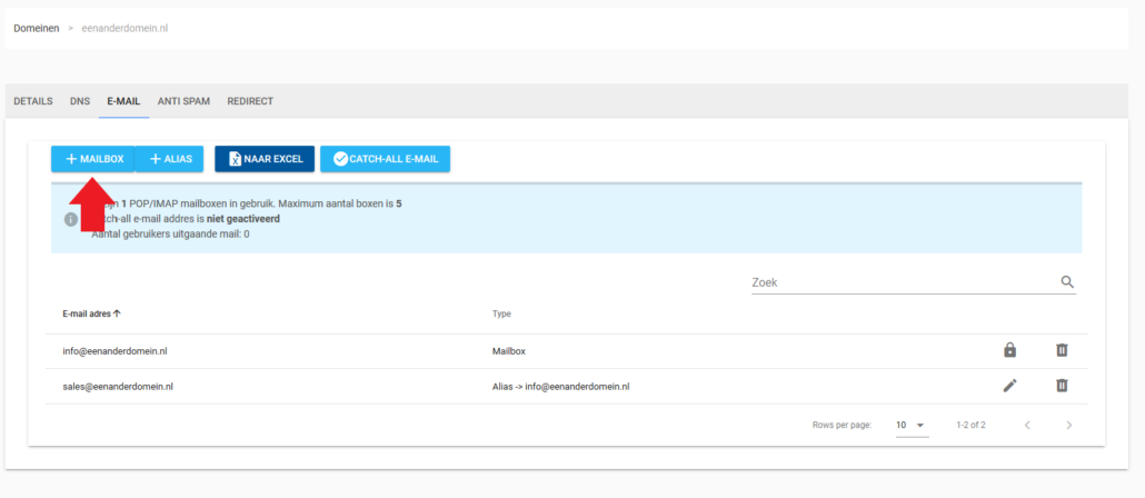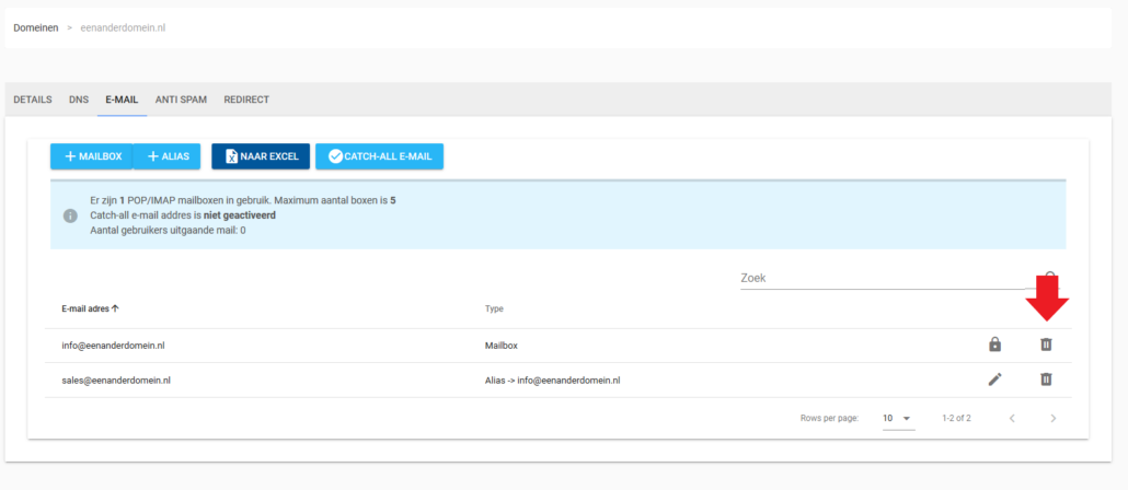 - Om de mailbox te verwijderen: Klik op het prullenbakje.