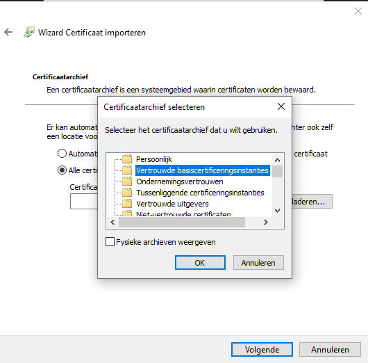 Wanneer je op “bladeren” klikt dan kies je voor “Vertrouwde basiscertificeringsinstanties“.