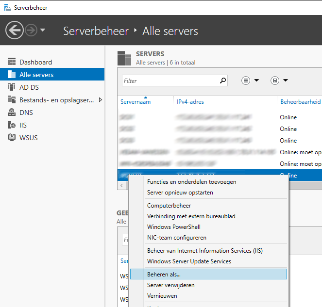Klik met de rechter muisknop op de server en kies voor “Beheren als…“.